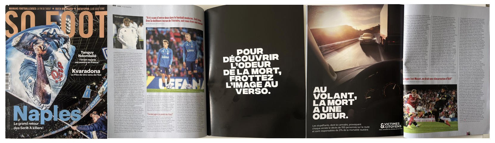 Diffusée à 100 000 exemplaires dans le magazine So Foot, la double page confronte le lecteur à l’odeur du cannabis pour révéler la cause d’un comportement dangereux au volant. En mobilisant l’odorat — le sens qui ancre le plus fortement la mémoire — la campagne crée un choc sensoriel pour rappeler que la conduite sous influence n’a rien de « cool » : elle tue.